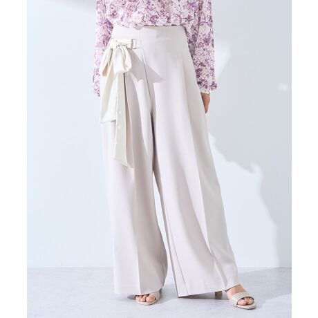 アシンメトリーにあしらわれたリボンベルトが印象的なワイドパンツ。