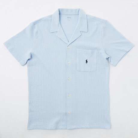 コットンと環境に配慮されたリサイクルポリエステルを混紡したニットシアサッカー素材を使用したショートスリーブパジャマトップシャツです。無地でありながら織柄がストライプに見える表面感と、軽い着心地が特長。ストレッチ性が高く、生地表面に凹凸のある構造がもたらす清涼感も魅力です。冷房が効いた室内での羽織アイテムとしても快適に着用できます。左胸ポケットに全ボディカラー共通のネイビーで入れたブランドアイコンのポロプレイヤー刺繍もポイント。同素材を使用したショートパンツ(RM8-B306)も展開しているので、セットアップでの着用もオススメです。