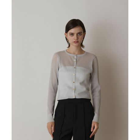 スイッチシーズンの軽い羽織りに便利なニットカーディガン。ナイロンポリエステル素材にリブ編みを施して、シンプルながらも表情感を楽しめる一枚に仕上げました。シーズンらしい程よいシアー感に、控えめなラメ感が上品&華やかに着映えます。デイリーカジュアルにはもちろんのこと、ドレスにさっと羽織ったり、お食事会などの特別な日やオケージョンスタイルにもおすすめです。