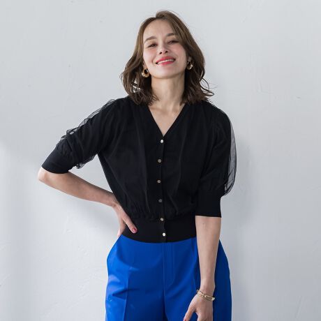 繊細なチュール素材を重ねた1枚で着映えるニットカーディガン。