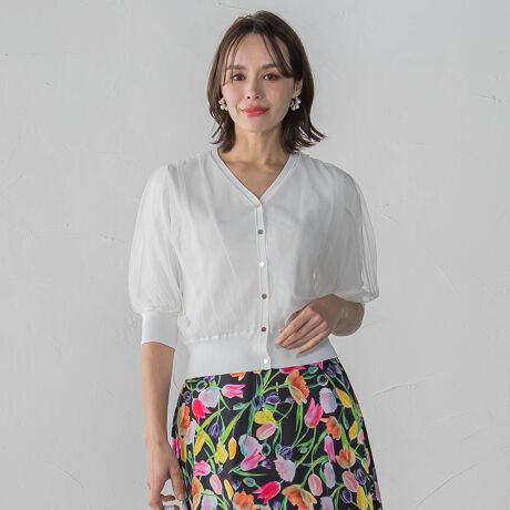 繊細なチュール素材を重ねた1枚で着映えるニットカーディガン。