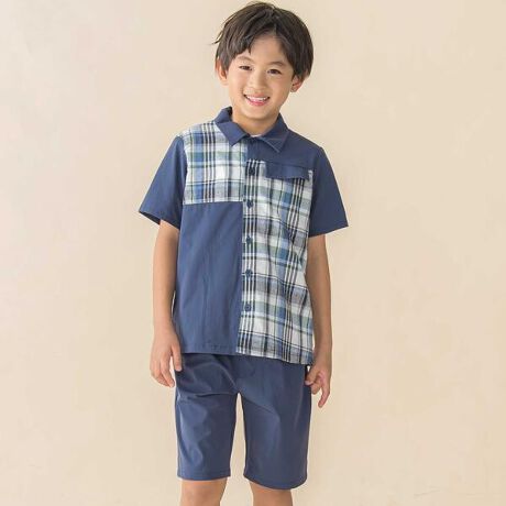 チェック&無地切り替え半袖シャツ+ハーフパンツセットアップ(95~150cm)