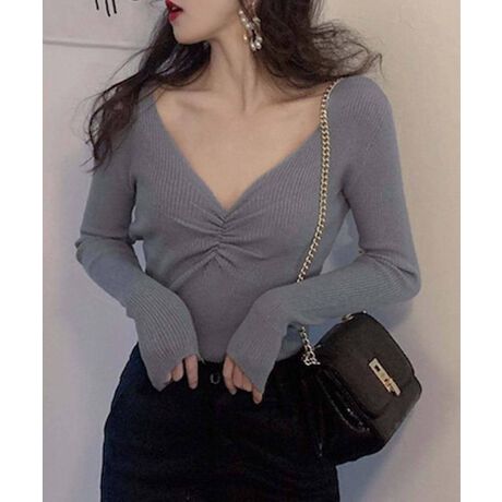 シンプルで美しいラインを作り出すVネックリブ編みニットトップス。_x000b_程よくフィットし、女性らしいシルエットを引き立てる万能アイテム!