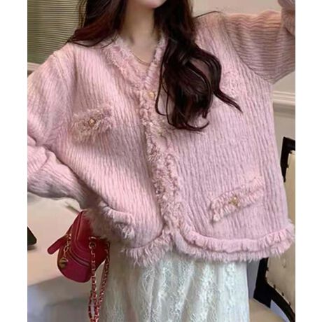 ツイード風の編み地が高級感を醸し出すニットカーディガン。