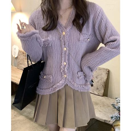 ツイード風の編み地が高級感を醸し出すニットカーディガン。