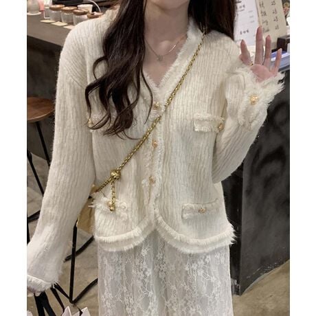 ツイード風の編み地が高級感を醸し出すニットカーディガン。