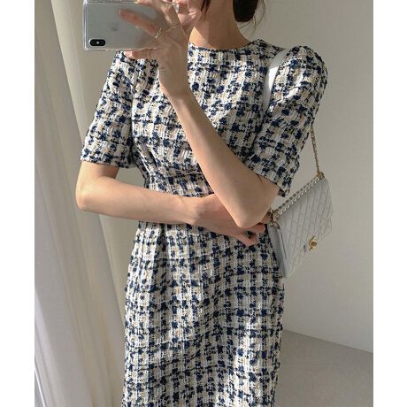 ・ツイード素材:やや艶感のある糸を使用したツイード素材が、リッチな印象を加えるワンピ。
