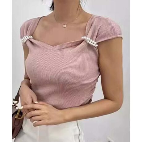 可愛らしさとエレガンスを兼ね備えた、ハートカラーとパールディテールが特徴の半袖Tシャツ。
