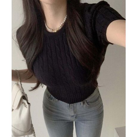 女性らしいシルエットを引き立てる、トレンド感たっぷりの短袖ケーブル編みニットプルオーバー。