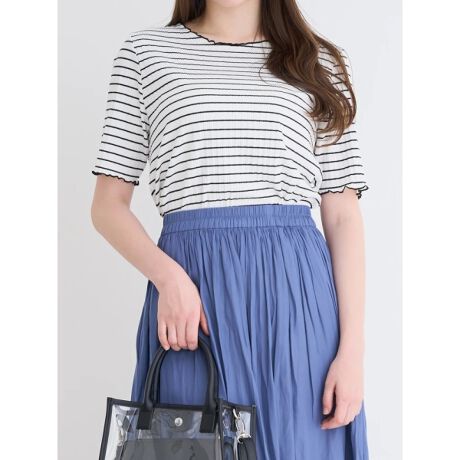 1枚でお洒落見えするメローデザインのトップスはシンプルなので柄のパンツやスカートとあわせてもごちゃつかず、シンプルTシャツとは違う華やかさも◎。