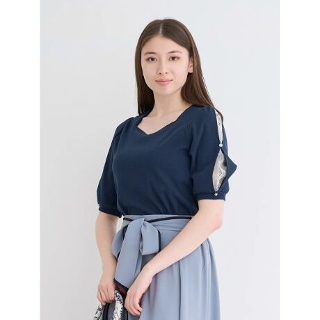 スリーブのレース切り替えがさりげなくフェミニンなムードを高めてくれるトップス