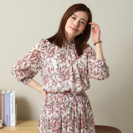 顔周りを華やかに演出してくれるシャーリング衿のブラウス。