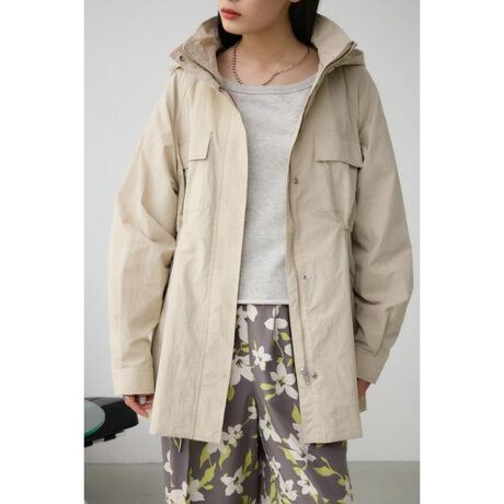 ■2WAYマウンテンコート■ポイントオーバーなシルエットが可愛いマウンテンコート。■ディティール撥水加工を施した、軽いシボ感のあるナイロン素材を使用。フード部分は取り外し可能。スタイリングに合わせてフーディとスタンドネック2wayでの着こなしをお楽しみ頂けます。ヒップまで隠れる着回しやすいミドル丈。こなれ感のあるオーバーシルエットとたっぷりと分量の入ったアンブレラヨークがポイント。カジュアルになりすぎず、程よくレディライクな雰囲気に仕上げました。■スタイリングデニムやスウェットを合わせたカジュアルなスタイルはもちろん、キレイ目なスラックスなどをあわせた着こなしもおすすめです。■生地ナイロンタスラン 撥水加工付きです。撥水加工は、永久的なものではなく、着用や洗濯、クリーニングをくり返すことにより、効果が低下します。透け感:なし裏 地:なし伸縮性:なし光沢感:なし[注意事項]※画像の商品はサンプルです。実際の商品と仕様、加工が若干異なる場合があります。※画像の商品は光の照射や角度、お使いのモニター環境により、実物と色味が異なる場合がございます。※着用、お取り扱いの際は、アテンションタグをご確認ください。