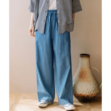 普段使いしやすい綿素材で仕立てたイージーパンツ。ワンピースの下にも合わせやすいシンプルなデザインです。ウエストのフリルがトップスインした時のアクセントに。ぐるりとゴムのウエストで楽に履いて頂けます。ひもでサイズ感の調節もできます。両サイドにポケット付き。