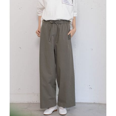 普段使いしやすい綿素材で仕立てたイージーパンツ。ワンピースの下にも合わせやすいシンプルなデザインです。ウエストのフリルがトップスインした時のアクセントに。ぐるりとゴムのウエストで楽に履いて頂けます。ひもでサイズ感の調節もできます。両サイドにポケット付き。