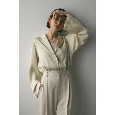 モデル身長162cm(FREEサイズ着用)表面感のあるサテン素材を使用したテーラーシャツ。袖ラインは肘部分でやや細くし袖口にかけて広がるシルエットに仕上げたことで、腕周りをより細く長く見せてくれます。ポケットはあえて上に設定しているのでスタイルアップ見せしてくれる一枚です。ストレッチあり、透け感なし。【お手入れ方法】手洗い可
