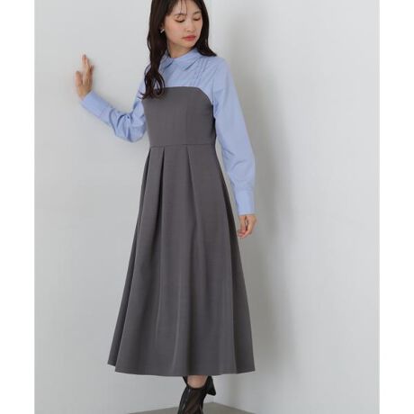 シャツをレイヤードしたように見せてくれるドッキングワンピース。胸元はすっきりと切り替え、スカート部分は裾にかけて広がるシルエットです。着崩れの心配がないドッキングデザインで着こなしやすく、後ろファスナーで着脱いただけます。