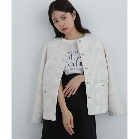 襟と前立てにサテンパイピングを施した、すっきりとしたセットイン型のツイードブルゾン。さり気ないポケットのフリンジデザインがポイントです。白金カラーの釦もポイントで、デイリー使いだけでなく、華やかなオケージョンシーンにも着用いただけます。