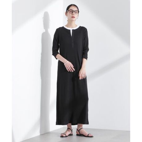 端境期に重宝する五分袖丈のカジュアルカットソーワンピース。トレンド感のあるフロントのホックテープをポイントに、マキシ丈の縦長シルエットが大人見えする一着です。