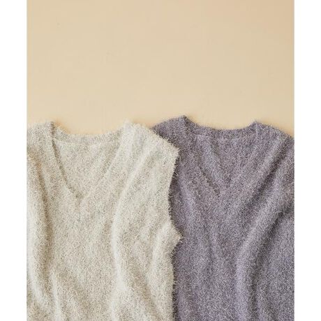 表情ゆたかなラメフェザーを使用したニットベスト。首元がすっきり開いたVネックなので、お持ちのインナーを合わせた時に重たく見えない着こなしに。身頃はゆったりとしたシルエットのため、季節に合わせて長袖からノースリーブアイテムまでレイヤードスタイルが楽しめます。