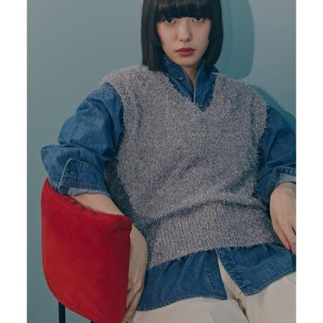 表情ゆたかなラメフェザーを使用したニットベスト。首元がすっきり開いたVネックなので、お持ちのインナーを合わせた時に重たく見えない着こなしに。身頃はゆったりとしたシルエットのため、季節に合わせて長袖からノースリーブアイテムまでレイヤードスタイルが楽しめます。