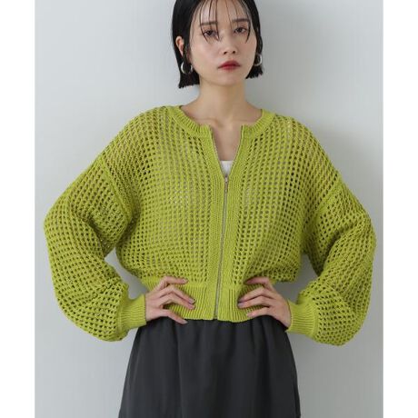 ヘルシーな肌見せが叶う、これからの季節にぴったりなメッシュニットカーディガン。ドロップショルダーでゆったりと羽織ることができるデザインです。フロントジップもデザインポイントにひと役。裾はリブ編みなので、ジップを閉めて着るとブラウジングのようにとまり、トップス風に着こなせます。