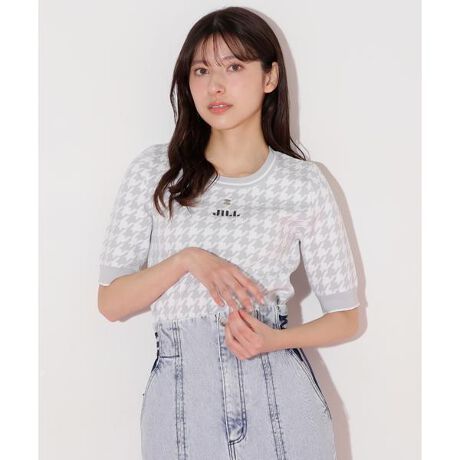 クラシカルな雰囲気の千鳥柄とリブ柄を組み合わせた半袖ジャガードニットです。フロントにはオリジナルプレートと刺しゅうを施し、さりげなく高級感をプラス。シンプルながらも存在感のあるデザインで、コーディネートの主役になる一着です。程よくフィットするシルエットが女性らしいラインを引き立て、スタイルアップ効果も期待できます。スカートやデニムアイテム、ワイドパンツなど、合わせるボトムス次第でカジュアルにもきれいめにも着こなせます。※撮影時照明の関係により、色味が違って見える場合がございます。またパソコン・スマートフォンなどの環境により、若干製品と画像のカラーが異なる場合もございます。予めご了承ください。商品の色味は、商品単品画像をご参照下さい。※商品画像はサンプルのため、色味やサイズ等の仕様に変更がある場合がございますので、予めご了承ください。