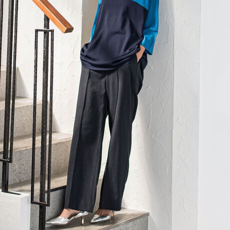 脚長効果のある美脚ワイドシルエットにセンターピンタックを施こすことで、