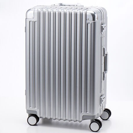 ボディは本物のアルミニウムのようなアルミ調ポリカーボネートフィルムを使用。アルミよりも自重が軽く仕上げられ、移動する際のからだの負担を軽減します。ボディのコーナーパッドはアルミ製を採用。角の傷つきやへこみからスーツケースを守ります。