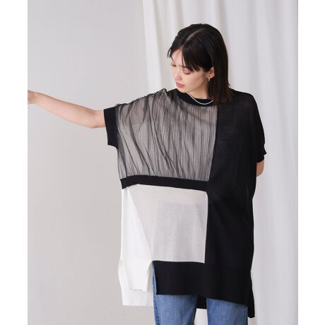 胸元にあしらわれたシフォンのプリーツが、さりげなく上品な華やかさを演出。目を引くブロック配色で、シンプルなのに印象的なデザインに仕上げました。裾のリブ部分にはスリットを入れて、動きをプラスしています。ニットとシフォンの異素材使いが特別な印象を与える、1枚で完成されたスタイルです。