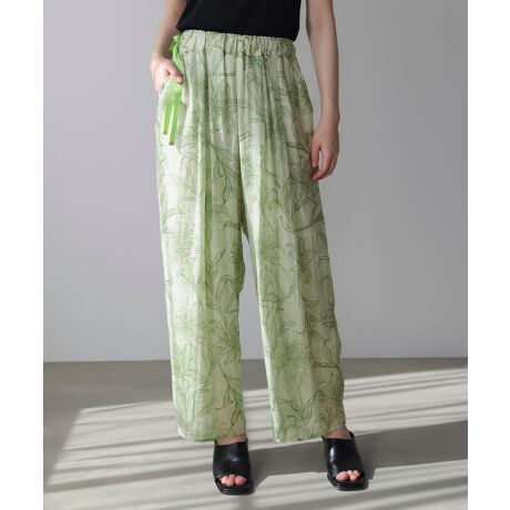 表情のあるシアーツイルプリント生地で、たっぷりと生地を使用したダブルタックパンツ。サイドに垂らしたグログランがアクセント。