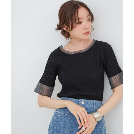 部分的に施された透け感が魅力的なシアー使いリブニットトップス。クルーネックでオンでもオフでも使えるアイテムなのでカジュアルからオフィスシーンまでご着用いただけるアイテムになっています。衿ぐりと袖口にさりげなく施されたシアーニットはきらめくニット素材を使用し、シンプルなデザインにちょっとした華やかさをプラス。フロントのランダムなリブデザインが着映えも叶えてくれる、色違いで揃えたくなる万能トップスです。