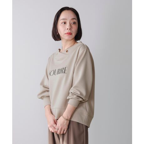 パウンドケーキの様に軽く柔らかい素材を使用。 柔らかくもっちりとした肌触りで、着心地抜群。フロントの衿が広く開いたデコルテ周りを女性らしく見せてくれる1枚.。一癖あるデザインでコーデのポイントに!さりげなく光るロゴのビジューもポイント