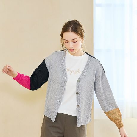 ざっくりとしたローゲージで編んだナチュラルな雰囲気のニットカーディガン。ドライタッチで清涼感のある和紙を使用しています。大胆なバイカラー使いが他にはなくお洒落な雰囲気。
