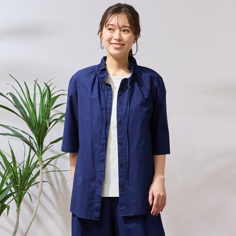 【手洗いOK・綿100%・セットアップ対応】襟ギャザーデニムブラウス