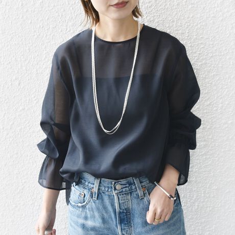 インナーにキャミソールやロゴTなどを合わせたり、ジャケットやアウター、ニットの中に着て袖元や裾を見せたりと、一枚でもレイヤードアイテムとしても楽しめるシアーブラウスです。