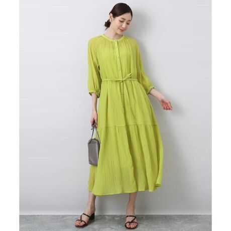 甘すぎないティアードデザインが1枚で映える、この季節におすすめの楊柳ワンピース。しっかりとした長めの丈感が今っぽく、リラックスムードで着用可能な1枚です。素材感はさらりとしたドライタッチな手触りで、ほんのりと涼しげなシアー感があります。同色のインナードレス付きなので、普段のインナーで着用できそうです。ずっしりとした重たさもなく、柔らかな質感で肌あたり良く着られました。