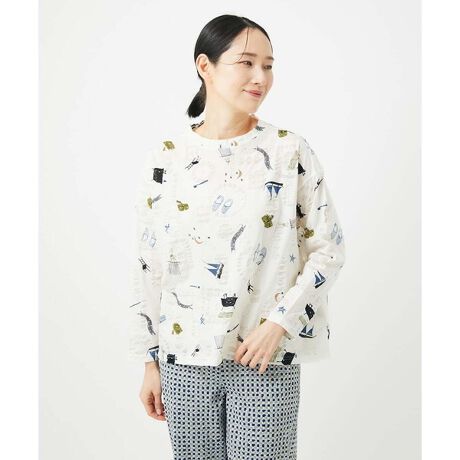 バスルームにまつわるアイテムをプリントにした、遊び心をくすぐる楽しいトップスです。ゆったりとしたシルエットに、衿に少し高さをつけて、1枚着でも様になるデザインにしました。一度袖を通すとやみつきになる、爽やかな着心地感が特徴です。