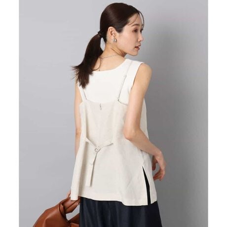 サイドにスリット、後ろに調整カンが付いていて、シルエットのアレンジも楽しめるキャミビスチェ。インナーにTシャツやタンクトップなどを合わせてレイヤードアイテムとして着こなして。