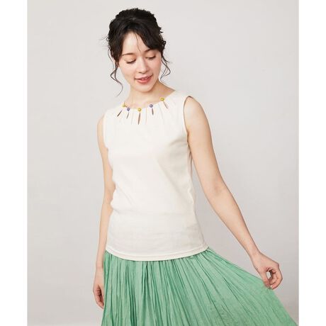 ホコモモラで毎年定番のインナーシリーズ。ほどよいフィット感のあるすっきりシルエットのタンクトップです。襟元のタックと涙開き、交互に並んだ配色ボタンがデザインのアクセントに。デイリー使いにぴったりなタンクトップはヘビーユース間違いなしのアイテムです。