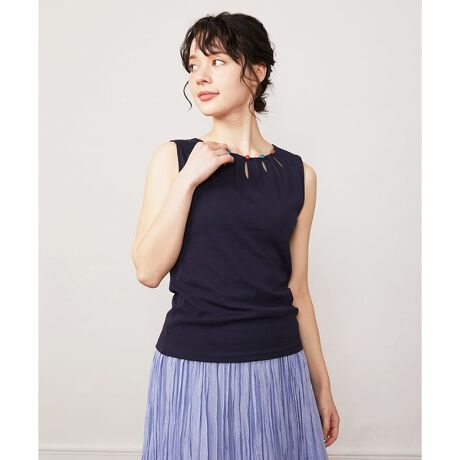 ホコモモラで毎年定番のインナーシリーズ。ほどよいフィット感のあるすっきりシルエットのタンクトップです。襟元のタックと涙開き、交互に並んだ配色ボタンがデザインのアクセントに。デイリー使いにぴったりなタンクトップはヘビーユース間違いなしのアイテムです。