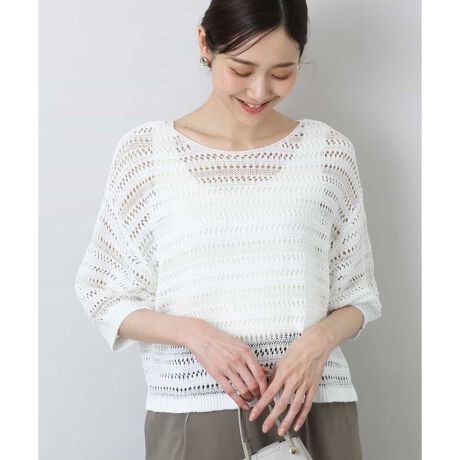 カギ針編み風にざっくりと編み立てたボーダー状のメッシュ柄ニットプルオーバー。ショートの着丈が合わせやすく簡単にスタイルアップ見えが叶います。