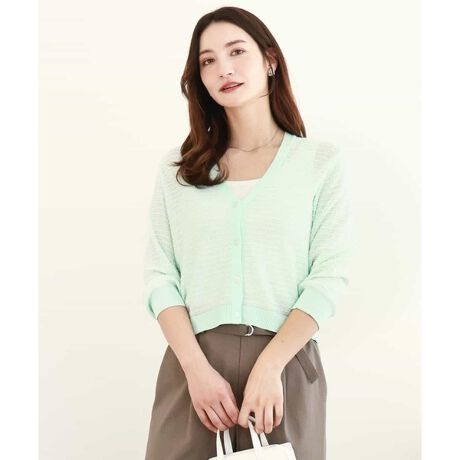 クロップド丈が軽やかに着こなせるニットカーディガン。素材自体に凹凸があり、雰囲気のある着こなしが完成します。広めに開いたVネックは女性らしい印象に。