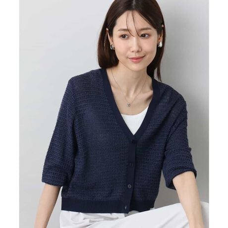クロップド丈が軽やかに着こなせるニットカーディガン。素材自体に凹凸があり、雰囲気のある着こなしが完成します。広めに開いたVネックは女性らしい印象に。