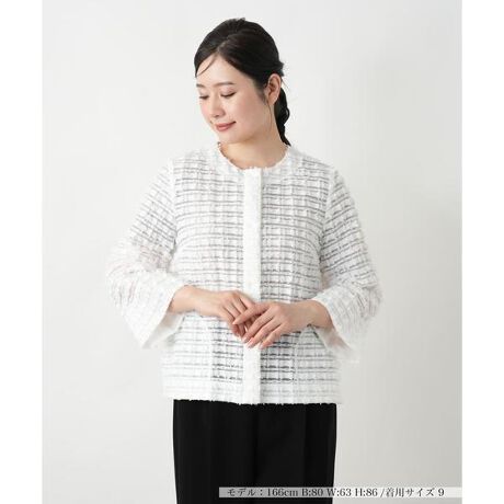 リボンを思わせる独特の表面感が特徴となった、涼やかなシアー素材のノーカラージャケット。シルエットはクロップドスリーブで軽やかさと抜け感をプラス。フロントはスナップボタン仕様になっており、スムーズな着脱が可能です。すっきりとした佇まいなので細身のパンツと合わせればモダンな印象に。ロングスカートとコーディネートすればフェミニンなエッセンスを加えた優雅なスタイリングも楽しめます。------------------------------------着用シーズン:初夏伸縮性:なし透け感:ありポケット:あり生地の厚さ:やや薄手-------------------------------------※商品の色味は、撮影場所や光のあたり具合、お客様のお使いの機器により色味が違って見える場合がございます。予めご了承ください。■□BOURGE(ブールジュ)・・・ライフステージが変化する年齢になって思う「これからの私」。新しい環境や役割の中で、理想の自分を見つけたい。自分の中に芽生える「新しい自分」を発見しながら自分をアップデートし続ける大人の女性のための日常服を提案します。□■