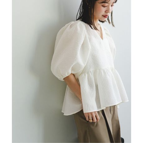 一見、可愛くなりすぎるペプラムもたっぷりとしたボリューム感を設けることで適度なスパイスさが生まれ、深めのVネックも相まって大人の格好良さも伝わるデザインです。