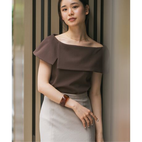 潔いデコルテの開きが女性らしさを引き立てるケープブラウス。