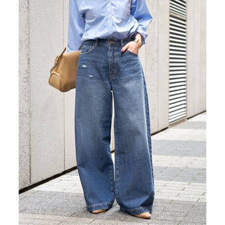 ハイライズで腰に程よい丸みを付けて裾にかけて広がるフレアシルエットは、ワイドデニムでもカジュアルに映りすぎない、女性らしく上品な印象に。