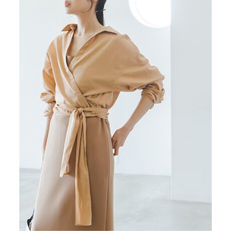 裾の糸ループにリボンを通し、後ろで回して前で結ぶ仕様。前でリボン結びをしてフェミニンに仕上げても、ラフに垂らすのもお勧め。カラーを合わせているニットライクジョーゼット2wayワンピースとセット風に着こなすのもお勧めです。