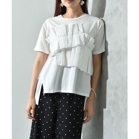 大胆なフリル切替が甘くなり過ぎず、大人かわいいスタイルが決まる1枚。合わせやすいベーシックカラーの展開で、お手持ちのワードローブにも合わせやすい展開にしています。
